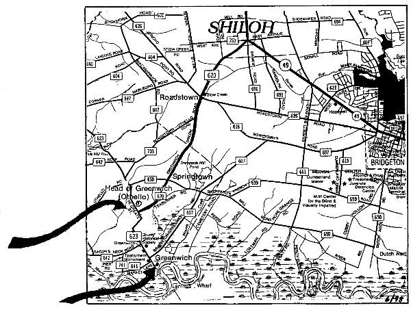 From the east, take Route 49 west into Bridgeton, follow 49 west to Shiloh, turn left on Route 620, follow to T in the road (Route 623-Ye Greate Street).